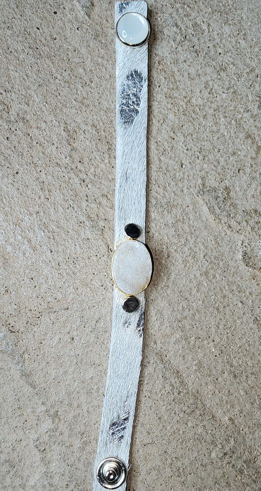 Silver Tone Hide Leather Bracelet with Drusy Stone